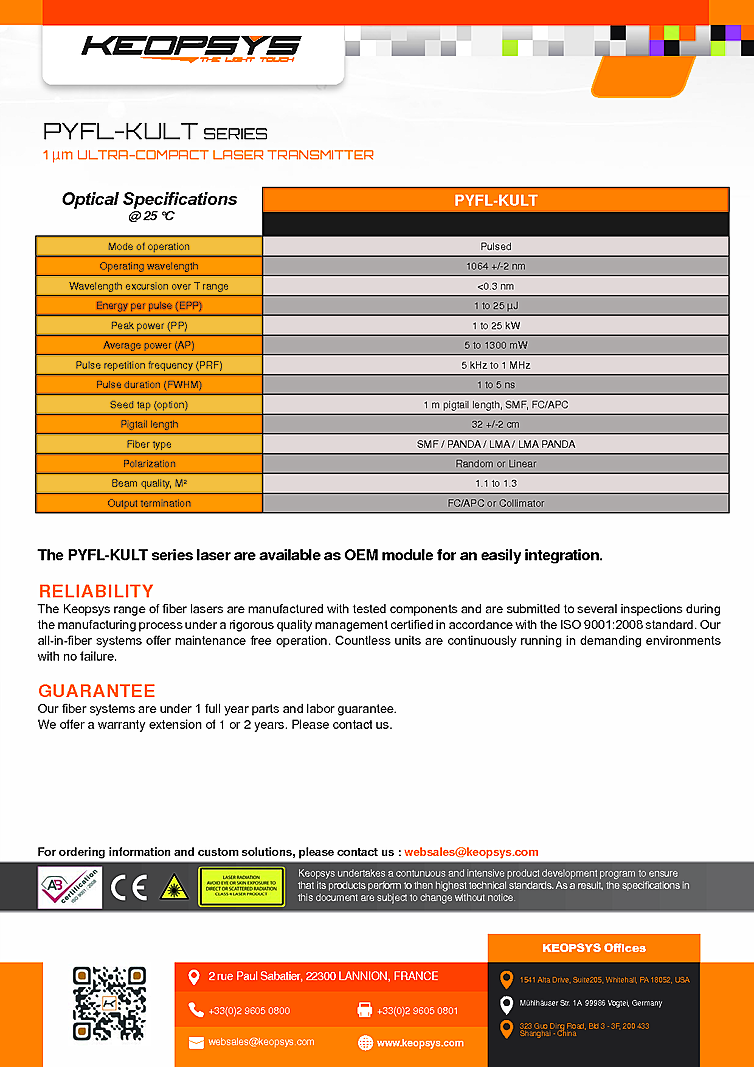 Nanosecond Fiber Laser from Keopsys: The data sheet below references an available pulse duration from 1ns to 50ns with a pulse repetition frequency from 5 kHz to 1 MHz in continuous or burst mode of operation. These nanosecond fiber laser modules are designed for integration into laser systems and features a compact and rugged package with low power consumption. Applications mentioned on the attached KEOPSYS data sheet include supercontinuum generation, harmonic generation, telemetry, range-finding, 3D scanning and mapping applications. The output beam is diffraction limited with either linear or random polarization. These lasers offer peak power up to 25 kW. The fiber laser output wavelength is 1064nm with high pulse energy up to 25 µJ.