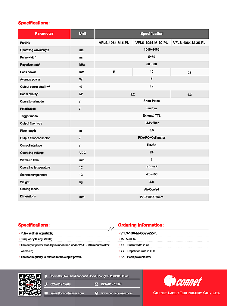 High energy nanosecond fiber laser from Connect Laser. Applications for the laser include LIDAR, range finding, 3D scanning, target detection and telemetry. Key features of the ns laser include adjustable pulse duration from 30 kHz to 500 kHz, excellent beam quality with M2 less then 1.3, and exceptional reliability. For OEM applications and easy integration the fiber laser module includes input of external and trigger-out. Adjustable pulse width from 5 nanoseconds to 50 nanoseconds for optimization in the application. Fiber output is FC/APC with collimator. Fiber laser peak output power up to 25 kW with average power of 5 watts. Nanosecond fiber laser with 1064 nm wavelength.