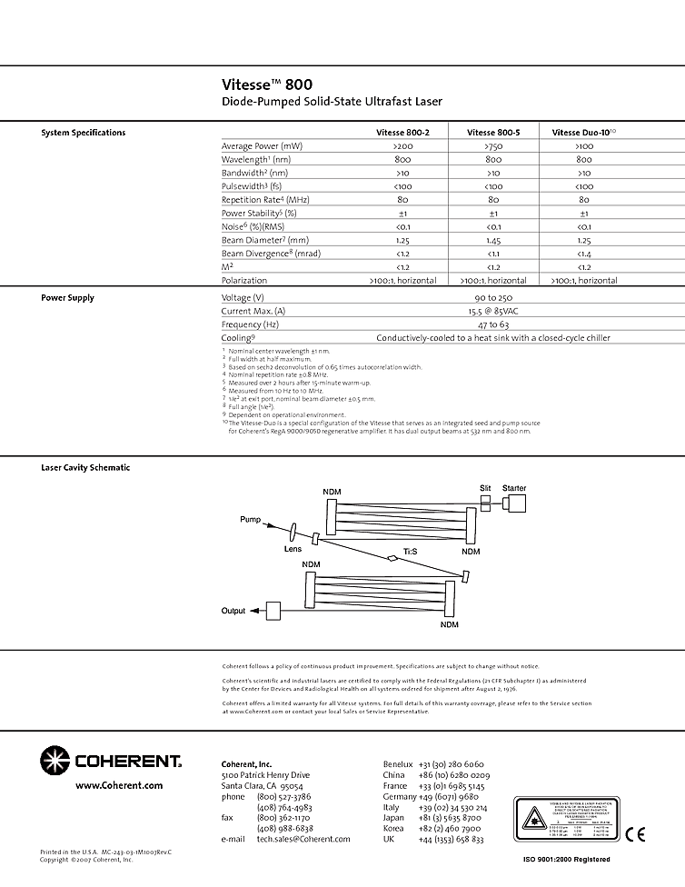Ti: Sapphire Laser with femtosecond pulse output from Coherent. Compact design and high quality laser diode pump source provide long laser lifetime. Ideal for scientific or OEM applications with hands-off and turnkey operation. Femtosecond laser has a optional dual output wavelengths of 532nm and 800nm. Repetition rate is 80MHz with a pulsewidth of 100fs. Power stability is +/-1% with noise less then 0.1% (rms). Beam quality is M2<1.2 with a divergence of 1.1mrad and beam diameter of 1.75mm. Femtosecond laser average output power is 750mW at a wavelength of 800nm.