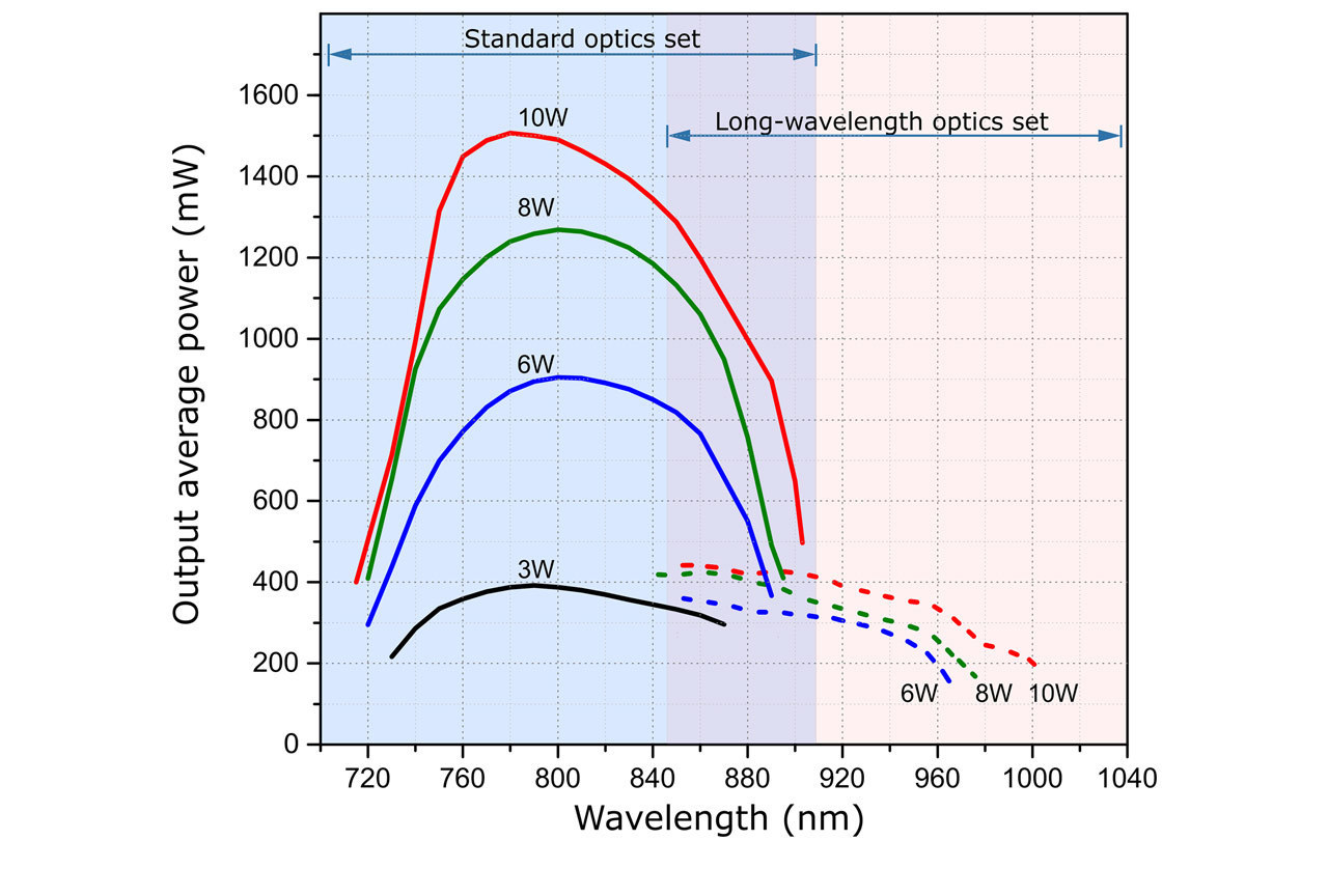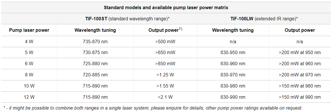 The system can be supplied as a stand-alone version for pumping by an external pump laser or as a version with an industry-standard pump laser integrated on site or at our factory. However, the dimensions of the Ti:S laser head are the same for either version, the stand-alone version may later be fitted with an integrated pump laser at minimum additional cost. The acceptable pump laser power for the TiF-100 is up to 12 Watts. See tuning curves in the datasheet for output power vs. wavelength dependence.