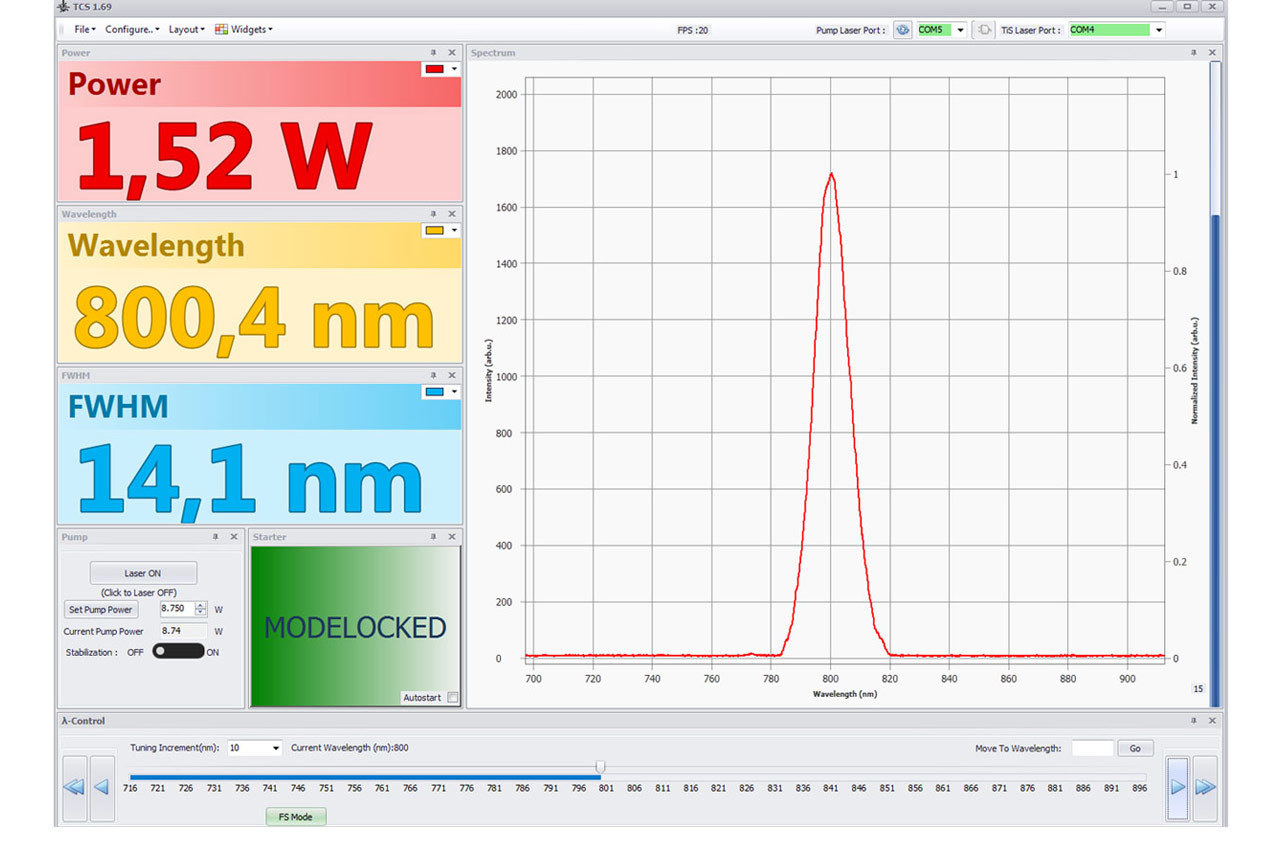 - the ‘Auto’ factory package includes a built-in spectrometer and power meter, single-touch wavelength tuning with presets, configurable widget software, active power lock function and automatic mode-lock start and monitoring. With this package the system boasts exceptional long-term stability and longer uninterrupted runtime.