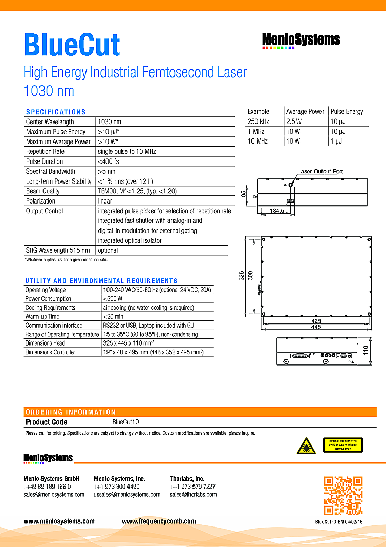 Femtosecond laser with high pulse energy output from Menlo Systems. Key features of the laser include Wavelength 1030 nm / 515 nm, Pulse Energy: >10 µJ, Average Power >10 W, Pulse Duration: < 400 fs and Burst Mode. Applications for the femtosecond laser include Micro Material Processing, Biomedical, Industries, and Scientific. Additional features include Single Shot to 10 MHz, Air Cooled, All-Fiber Technology, Compact Design for OEM Integration, Robust and Stable, Maintenance Free and Remote Control.