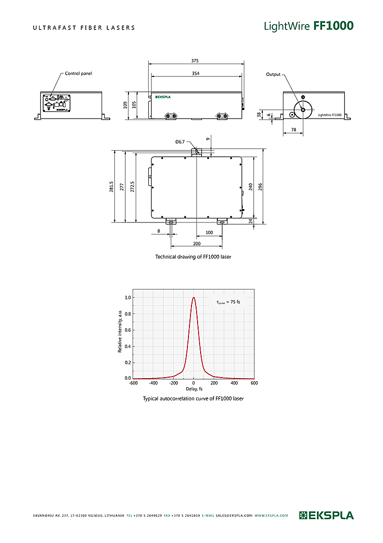 Fiber laser from Ekspla was designed for applications in non-linear microscopy such as two-photon, terahertz generation, and multi-photon polymerization. Femtosecond laser has pulse duration is output less then 80fs and pulse repetition of 30MHz. For simple laser integration the fiber laser is an all in one design, compact, and passively cooled no water or forced air required. Optical beam is collimated 2mm with a beam quality of M2<1.3. High peak power of 625kW is available from femtosecond laser output. Fiber laser wavelength is 1030nm with 2 watt average output.