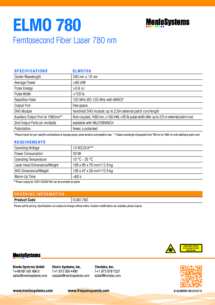Fiber laser with femtosecond pulse output from Menlo Systems. Designed for applications in Amplifier Seeding, THz Generation & THz Physics, Ultrafast Spectroscopy, Multi-Photon Excitation and 2-Photon Polymerization and 3D Printing. Standard features for the fiber laser include Handheld SHG Module, High Stability, Low Amplitude and Phase Noise, All-PM Solution, Single Mode-Lock State and figure 9® Technology. Femtosecond fiber laser with wavelength of 780nm and output power greater then 80 mW.