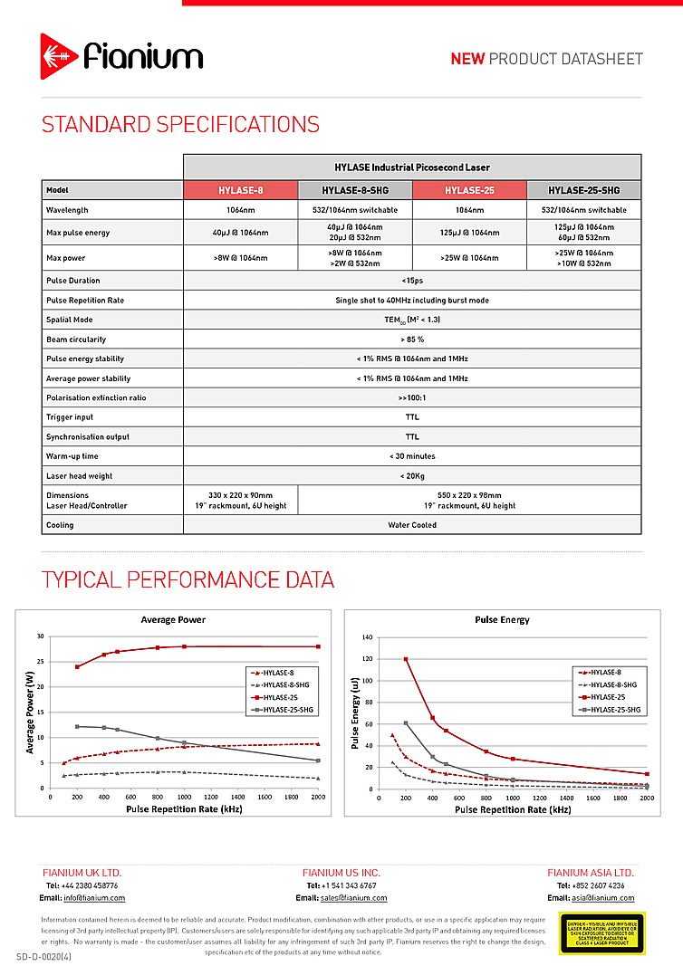 Picosecond laser from Fianium combines the reliability and low maintenance of an all fiber oscillator with a state-of-the-art amplifier. The ultra-compact laser head has the smallest footprint available enabling easy integration. High stability and long lifetime are provided by design for 24/7 industrial use. Key features of the laser include Maximum Average Power of 25W at 1064nm, Integrated Second Harmonic Generation module, M-squared <1.3 and Maximum Pulse Energy of 125µJ at 1064nm. The integrated pulse modulation enables: Single-shot to 40MHz and Flexible burst mode.