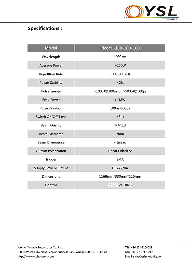 Fiber laser with pulse energy output and continuously tunable pulse from duration YSL Photonics. Applications for the fiber laser include Sapphire Dicing and Drilling, Ion Battery Foil Cutting, Glass Dicing and Drilling, Silicon or SiC Dicing, Metal Marking, Chrome Vanadium Texturing, and Micromaching of Transparent materials. Key features of the picosecond pulsed fiber laser include minimum pulse duration 100ps, peak power up to 1 mega-watts, and burst mode function. Beam aiameter of 2mm with a divergence <5mrad and beam quality of M2<1.3. Fiber laser repetition rate of 100kHz-1MHz provides pulse energy up to 500µJ at 500ps at a wavelength of 1030nm.