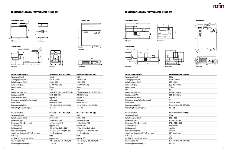 Fiber laser from Rofin was designed for applications in marking, material removal, reducing surface roughness and precision of selective layer removal. Picosecond fiber laser is easily integrated because of a compact 19“ plug-in for the laser control unit and can be integrated with a beam expansion. The fiber laser can be controlled via USB, TC/IP or RS-422 and includes a comprehensive marking software. The laser beam quality is M2<1.6 at TEM00. The pulse repetition interval is 200kHz to 800kHz with a pulse duration of 550ps at 400kHz. Average output power is 8 watts at 400kHz. Fiber laser wavelength is 1064nm with a pulse energy of 20µJ.
