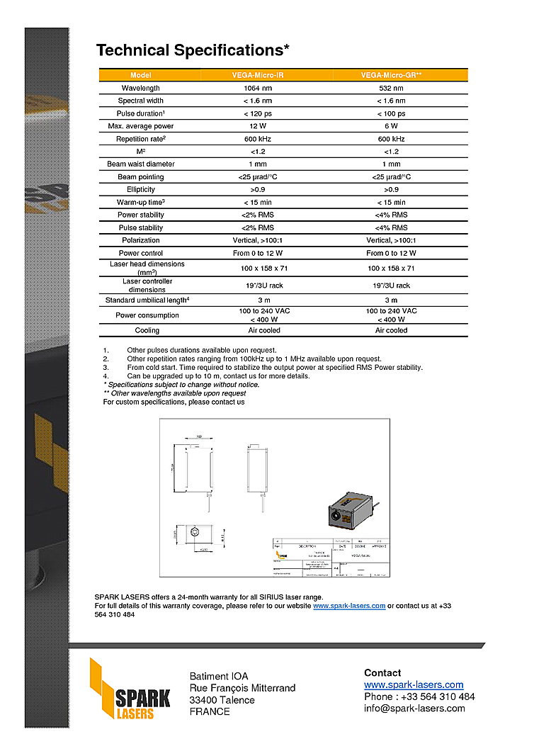 Fiber laser with high energy picosecond pulse output from Sparks Laser. The picosecond laser was designed for applications in Thin film ablation, Microelectronics, Medical & Bio-Medical. Rugged plug-and-play design is maintenance free and fiber laser includes worldwide 24 month warranty. Beam quality of M2<1.2 with beam diameter of 1 mm. Pulse repetition rate up to 600kHz with a pulse duraiton less then 100ps. Picosecond laser has up to 12 watts of average power output. Laser has power stability less then 2% RMS after 15 minute warm-up. Fiber laser output wavelength is 1064nm with pulse energy up to 20µJ.