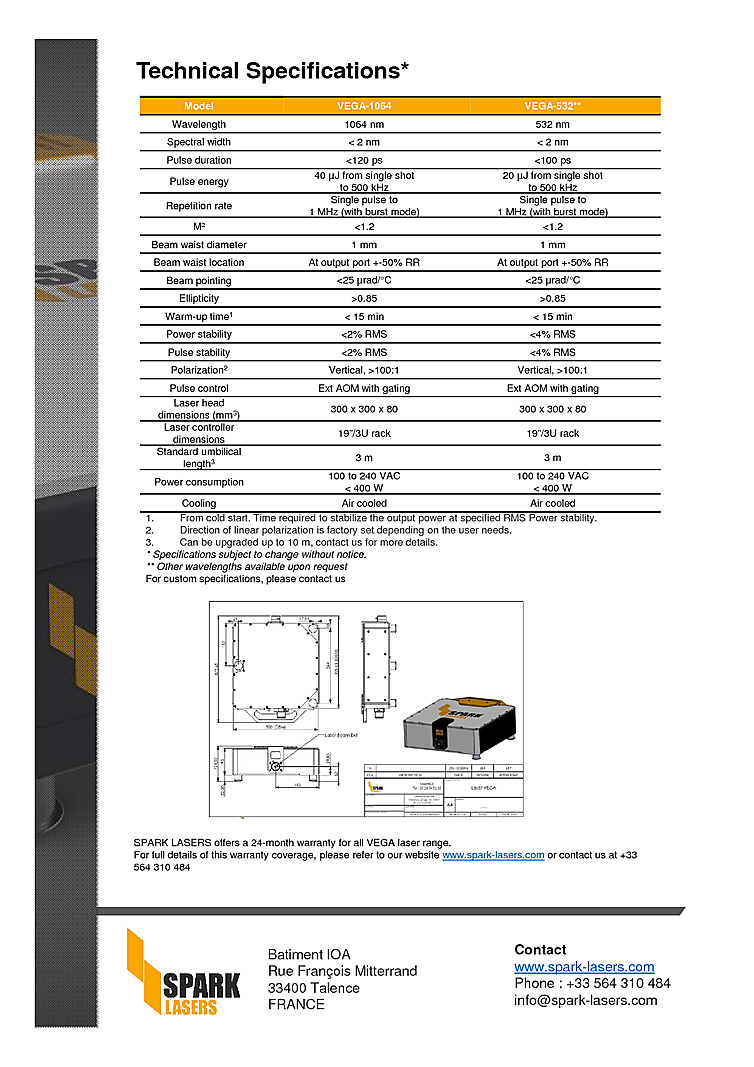 Fiber laser with high output power and picosecond pulse output from Sparks Lasers. The picosecond laser was designed for applications in Consumer Electronics, Automotive/Aerospace, Food industry, PV cells, Medical & Bio-Medical. Low cost fiber laser is maintenance free and includes 24 month worldwide warranty. Laser has a rugged design and is plug-and-play for fast integration. Fiber laser also features a seeder burst mode. Laser pulse repetition rate is adjustable from single shot to 1MHz with pulse duration of less then 120ps. Beam quality is M2<1.2 with a beam diameter of 1mm. Fiber laser output is 1064nm with pulse energies up to 40µJ.