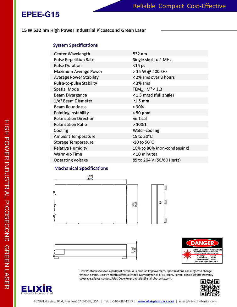High power picosecond laser green laser from Elixir Photonics. Picosecond laser applications include cutting and drilling of glass, ceramic semiconductor, sapphire, and thin films. Laser can also be used for precision machining or scientific applications. Laser is assembled in 1000 class clean room and features a compact design. Repetition rate of single shot to 2 MHz with pulse widths less then 15ps. Laser can be controlled via RS-232 remote computer interface or external GATE control. Beam quality is TEM00 with M2<1.3. Picosecond laser with 532nm wavelength and pulse energies up to 100 µJ.