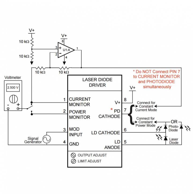 Precisely control the laser diode or photodiode setpoint current with the on-board Output Current Adjust trimpot or via a remote voltage to the modulation input. The modulation input’s small signal 3 dB bandwidth is DC to 2 MHz in constant current mode and dependent on photodiode speed in constant power mode.