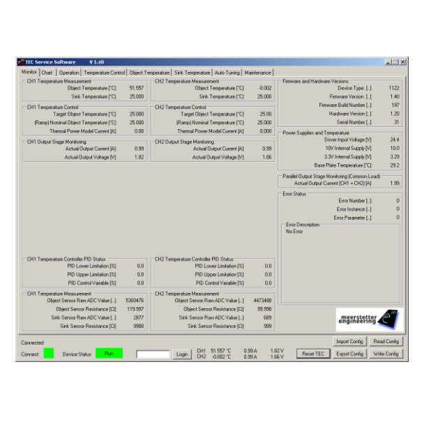 The TEC-1091 offers numerous communication and safety options for laser diodes. It has a PC-Software that allows configuration, control, monitoring and live diagnosis of the TEC controller via USB, RS485 and RS232 TTL. All parameters are saved to non-volatile memory. Saving can also be disabled for bus operation. For the most straightforward applications, only a power supply, Peltier elements and two temperature sensors need to be connected to the TEC-1091.