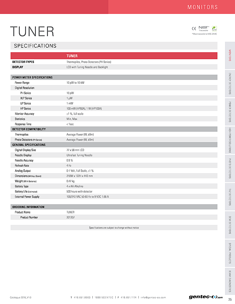 Gentec-eo Handheld Optical Power Meter with tuning needle. Connects to all gentec-eo optical power sensors and displays in watts or dBm. Optical power meter has a large LCD display and 3 display functions for the tuning needle. Designed for long battery life because of low power consumption.