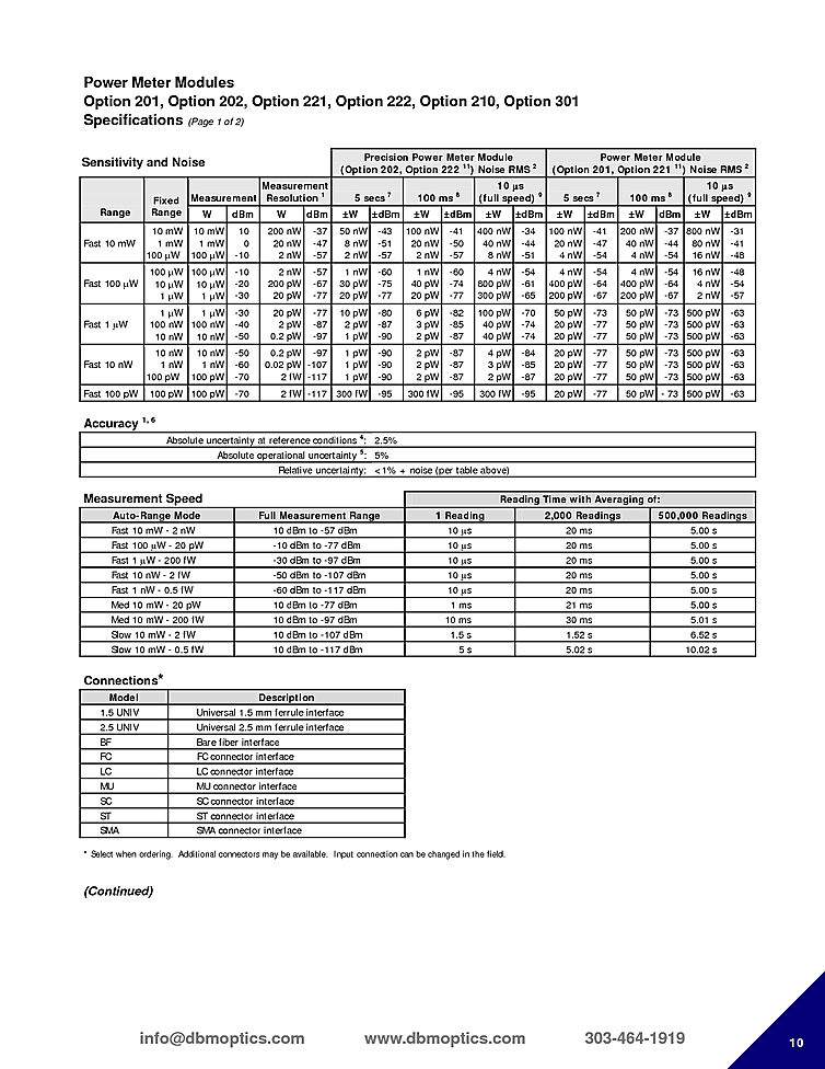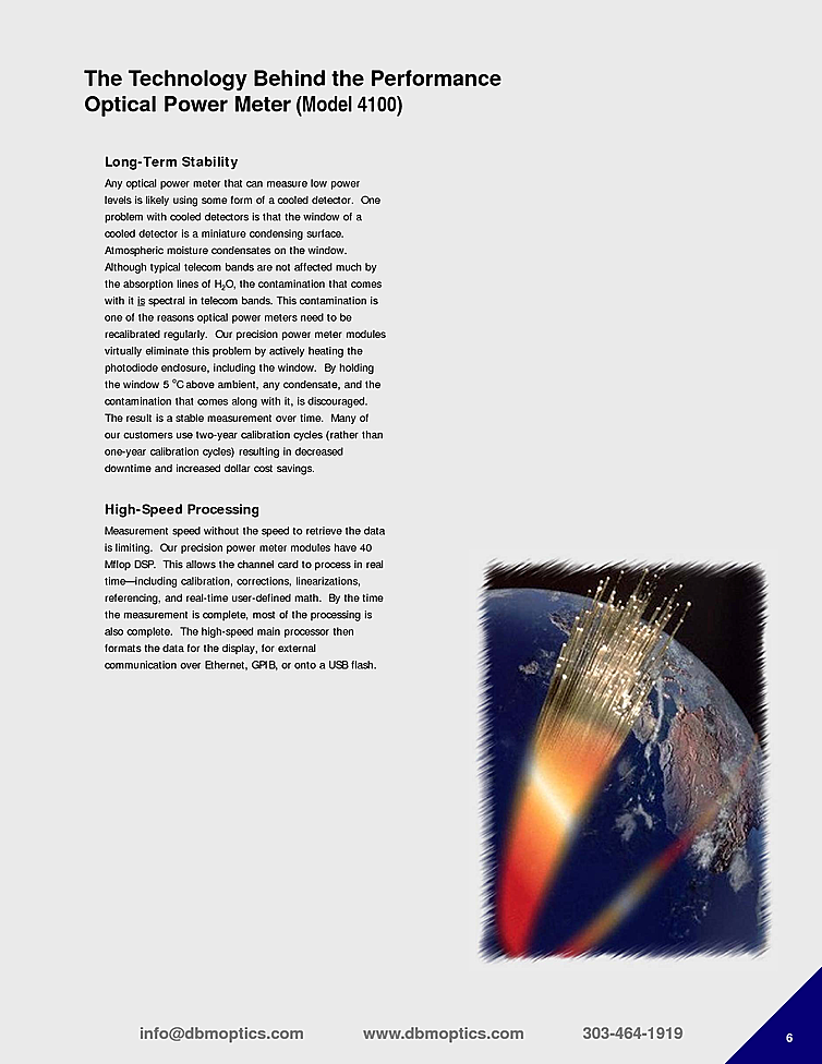 Integrated meter and sensor from dBm Optics provides fast, accurate power measurement from 800nm to 1700nm. Wide dynamic measurement range from +10 dBm to -95 dBm. Optical power sensors are integrated into the benchotp meter providing a compact easy to use platform for measurement of telecommunication laser diodes. Low Polarization Dependency is possible from patented technology that achieves < 0.0015 dB which provides error-free measurement, even with highly polarized light. For automated tests the optical power meter has built in GPIB or Ethernet remote interfaces. The optical power meter can also output results to a USB port for easy data storage and retrieval.