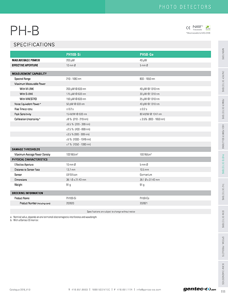 テクノロジー: Si Photodiode,Thermopile,Integrated Meter / Monitor,Integrating Sphere,InGaAs Photodiode,Ge Photodiode,Pyroelectric