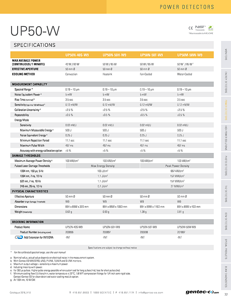 Large aperature Optical Power Sensor from Gentec-EO. High damage threshold with measurement up to 100kW/cm-squared in average power density. Calibration data is stored in optical sensor for seamless use between optical power meters. Gentec-EO optical power sensor for power ranges from 5mW-80W and wavelength range of 190nm-20µm.