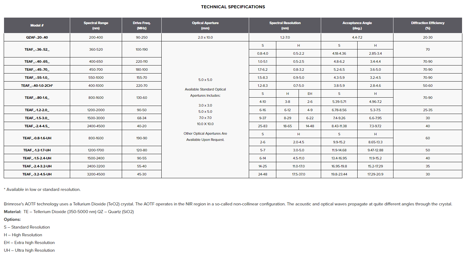 The Brimrose Acousto-Optic Tunable Filter (AOTF) is a solid state acousto-optic device with no moving parts. It functions as a tunable transmissive filter. It is able to precisely and rapidly adjust the wavelength, and intensity of the diffracted/filtered light by varying the RF power.