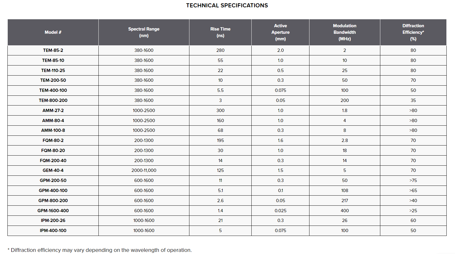 Brimrose offers AOMs in the wavelength range from the ultraviolet to LWIR regions for low and high optical power applications. Brimrose AOMs cover the frequency ranges from just a few MHz up to 3.5 GHz.