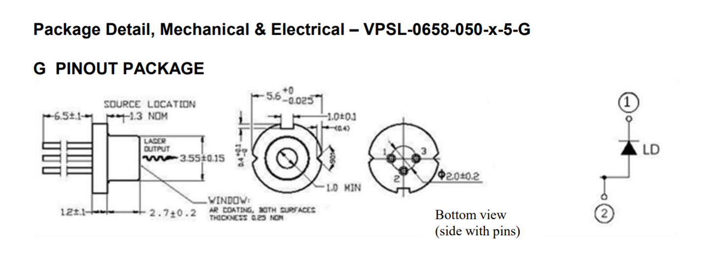 The VPSL-0658-050-x-5-G is a 0.65 µm band, AlGaAlP laser diode with a quantum well structure. It is suitable as a light source for large capacity optical disc memories, such as DVDRAM, and various other types of optical equipment. Combined with an integrated, internal, beam correcting optic and encased in a hermetic sealed package, this is a high-performance, highly reliable, and long life laser diode.