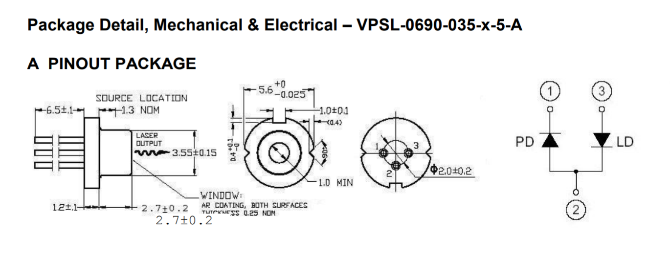 The VPSL-0690-035-x-5-A Laser Device is a 0.68 µm band, AlGalnP index guided, laser diode with a multi-quantum well (MQW) structure. It is suitable as a light source for large capacity optical disc memories, such as magneto-optical, and various other types of optical equipment. Combined with an integrated, internal, beam correcting optic and encased in a hermetic sealed package, this is a high-performance, highly reliable, and long life laser diode.