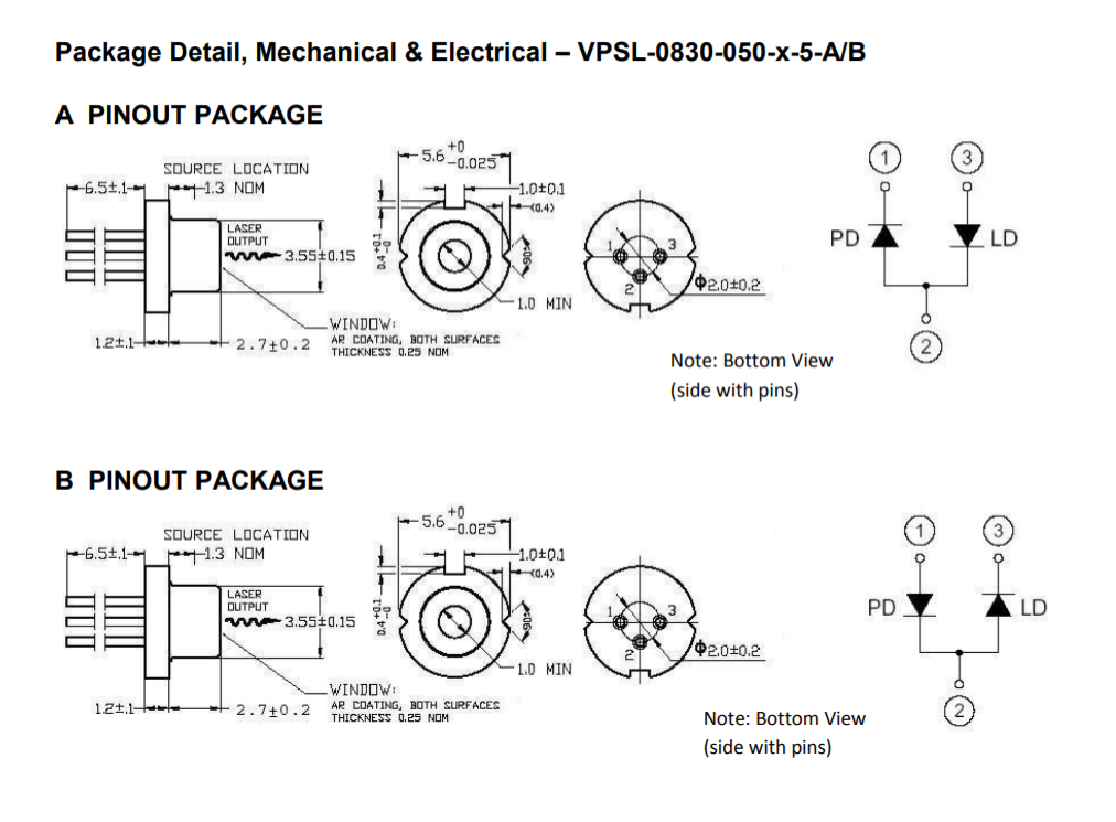 The VPSL-0830-050-x-5-A/B is an 830nm GaALAs laser diode useful for applications such as laser printers, measurement equipment, free space optical communications, and other laser based optical systems. A diffraction- limited and circular wavefront is accomplished through the integration of an internal, beam correcting optic. Hermetic sealing of the package assures high reliability.