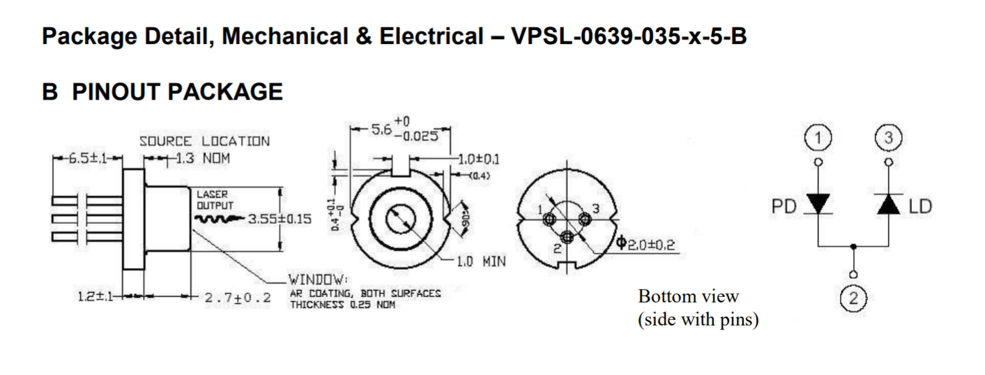 The VPSL-0639-035-x-5-B is a 0.63 µm band, AlGalnP index guided, laser diode with a multi-quantum well (MQW) structure. It is suitable as a light source for laser pointers and optical equipment for alignment. Combined with an integrated, internal, beam correcting optic and encased in a hermetic sealed package, this is a high-performance, highly reliable, and long life laser diode.
