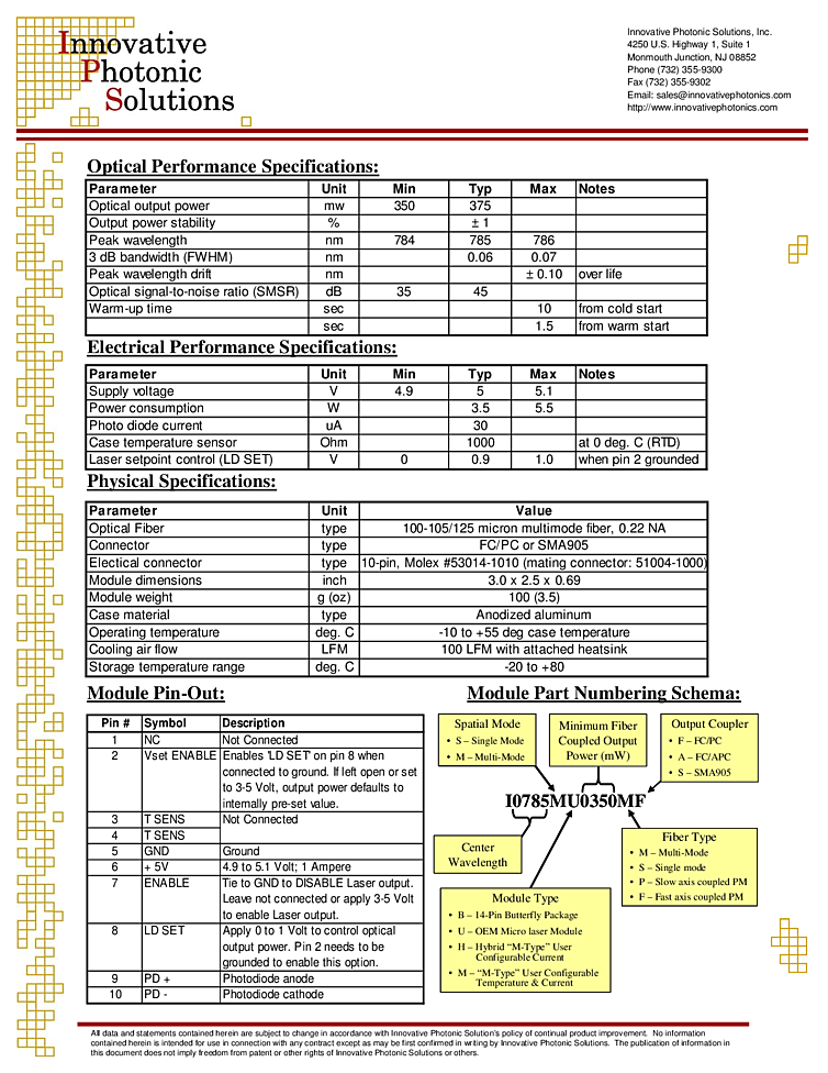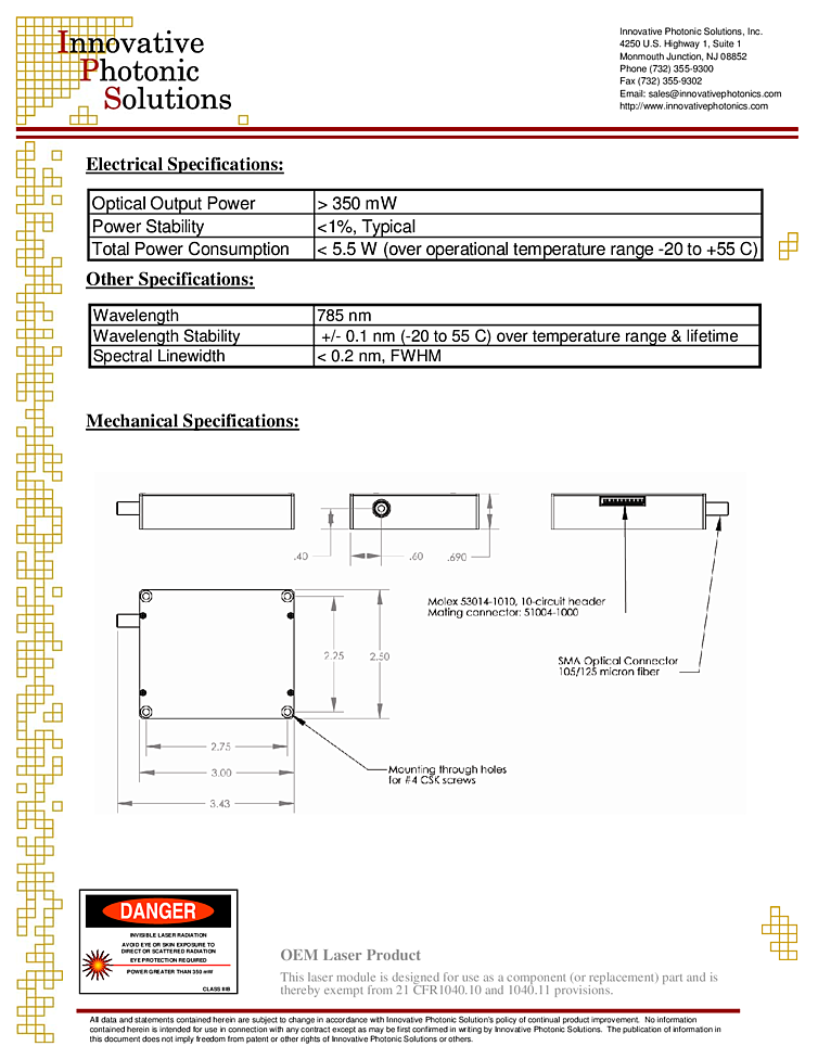 785nm Innovative Photonics High Power Multi-Mode Spectrum Stabilized Laser Subsystem: Proprietary Spectrum Stabilized Laser features high output power with narrow spectral bandwidth. The laser’s stabilized peak wavelength remains “locked” regardless of case temperature (-10 to +55 deg. C). Devices can be spectrally tailored to suit application needs and offer side mode suppression ratios (SMSRs) better than 40 dB, thereby providing extremely high signal to noise ratio and making these sources ideal for Raman spectroscopy and pump laser applications. The laser is integrated with high performance laser drive and temperature control electronics in a compact package weighing less than 4 oz.