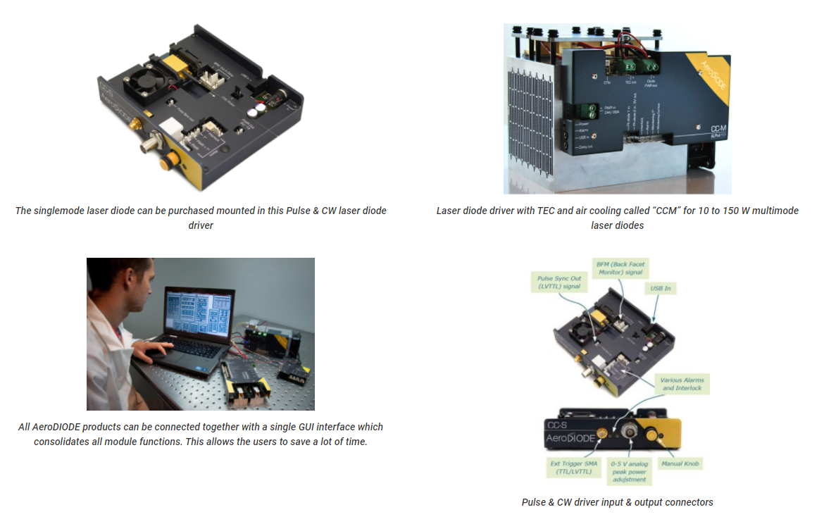 These fiber-coupled 808 nm laser diodes are offered as stock items or associated with a CW or Pulsed Laser Diode Driver. They are compatible with our high speed nanosecond pulsed drivers or high power CW and pulsed drivers with air cooling for the multimode laser diode versions.