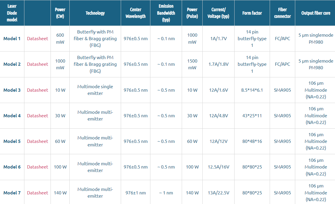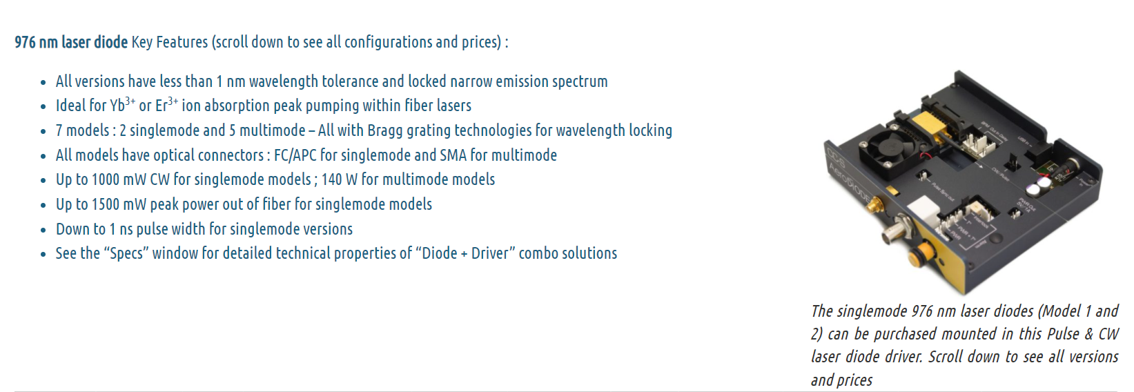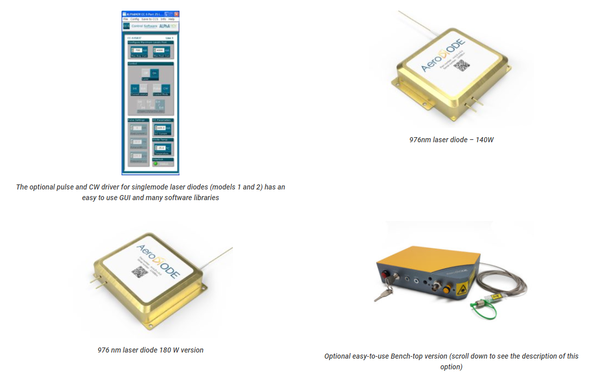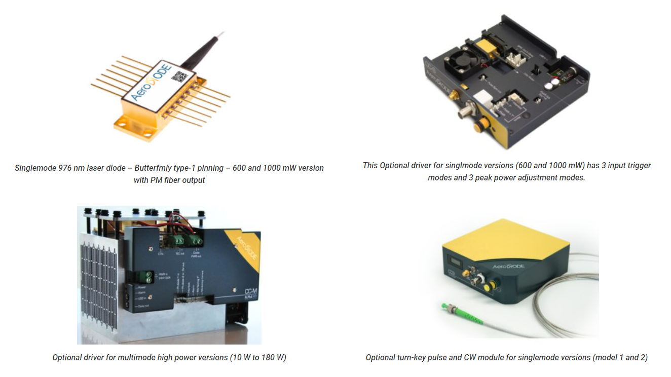 These fiber-coupled 976 nm laser diodes with optical connectors are offered as stock items or associated with a CW or Pulsed Laser Diode Driver. They are compatible with our high speed nanosecond pulsed drivers or CW drivers. All modules have narrow emission bandwidth for Yb3+ or Er3+ pumping (Bragg grating technology). Scroll down to see all configurations and prices.