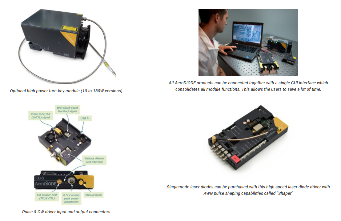 Most Turn-key 976 nm laser diode + driver solutions are optimized for single-shot to CW performances with pulse width lengths down to 1 nanosecond. The 976 nm laser diode precision pulses are generated internally by an on-board pulse generator, or on demand from an external TTL signal and can reach high power in nanosecond pulse regime up to 1500 mW. 5 multimode versions are offered for CW emission up to 140 W in a 106 µm core multimode fiber (NA=0.22). Every laser diode has it own optical connector : FC/APC for singlemode version, high power SMA905 for multimode versions.