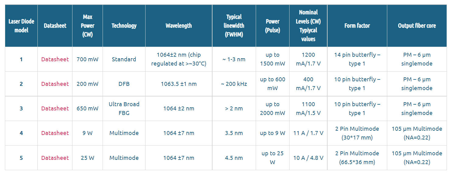 テクノロジー: Single mode Fabry Perot、DFB、Fabry Perrot with broad FBG、Single emitter Multimode、Multi-emitter Multimode