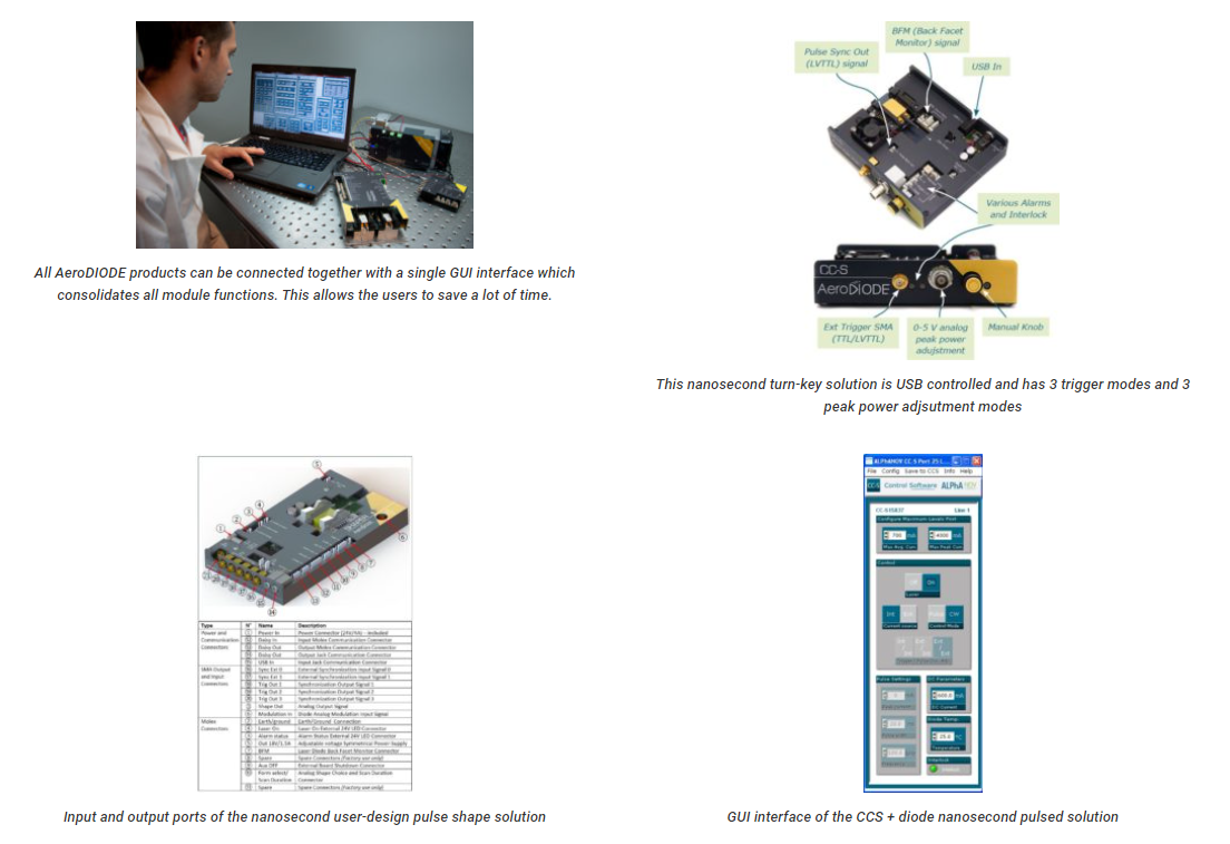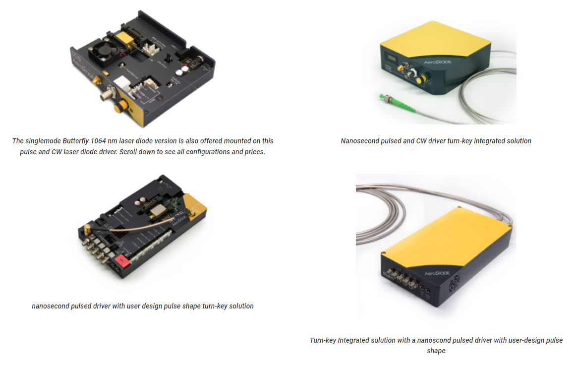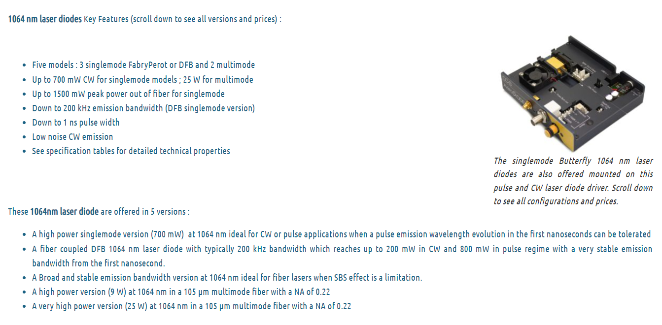 These 1064 nm laser diode can reach high power in nanosecond pulse regime up to 2 W. Most Turn-key diode+driver solutions are optimized for single-shot to CW performances with pulse width lengths down to 1 nanosecond. 1064 nm laser diode precision pulses are generated internally by an on-board pulse generator, or on demand from an external TTL signal. A multimode version is also offered for CW emission up to 10 W.
