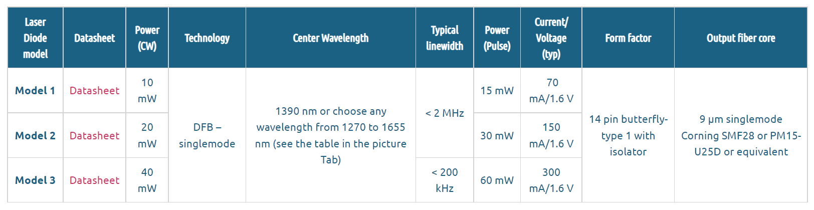 These fiber-coupled 1390 nm laser diodes are offered as stock items or associated with a low noise CW or Pulsed Laser Diode Driver. All 3 models are single frequency versions up to 40 mW. They are compatible with our high speed nanosecond pulsed drivers and this makes it an optimal solution for Telecommunication or 3D-sensing R&D.