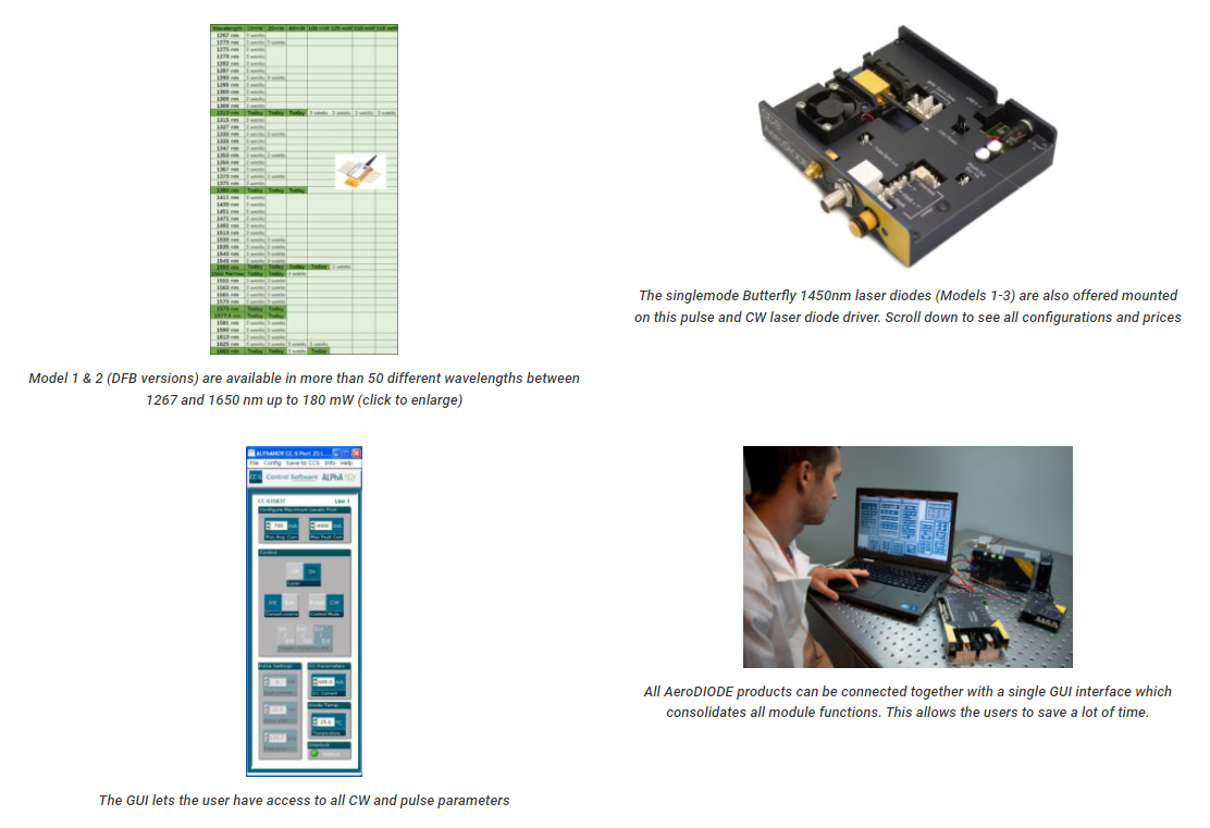 The singlemode 1450 nm laser diodes are extremely stable and low noise in CW regime due to the DFB or Bragg-grating technologies. Most Turn-key diode + driver solutions are optimized from single-shot to CW performances with pulse width lengths down to 1 nanosecond. The 1450nm laser diode precision pulses are generated internally by an on-board pulse generator, or on demand from an external TTL signal.