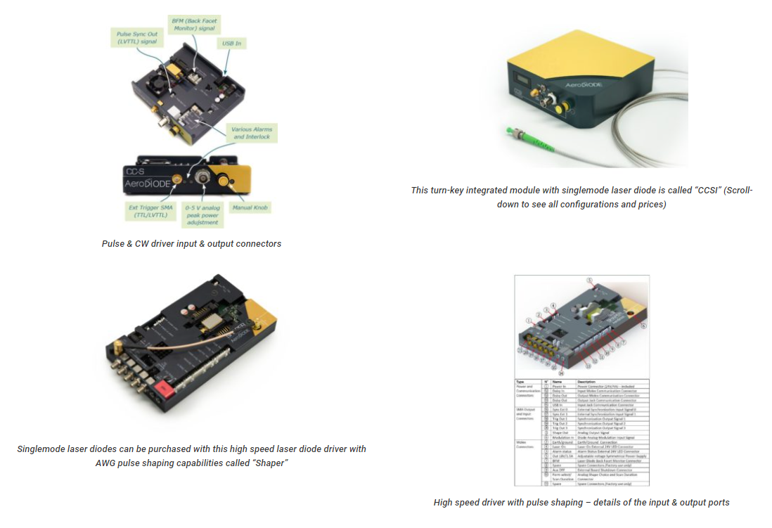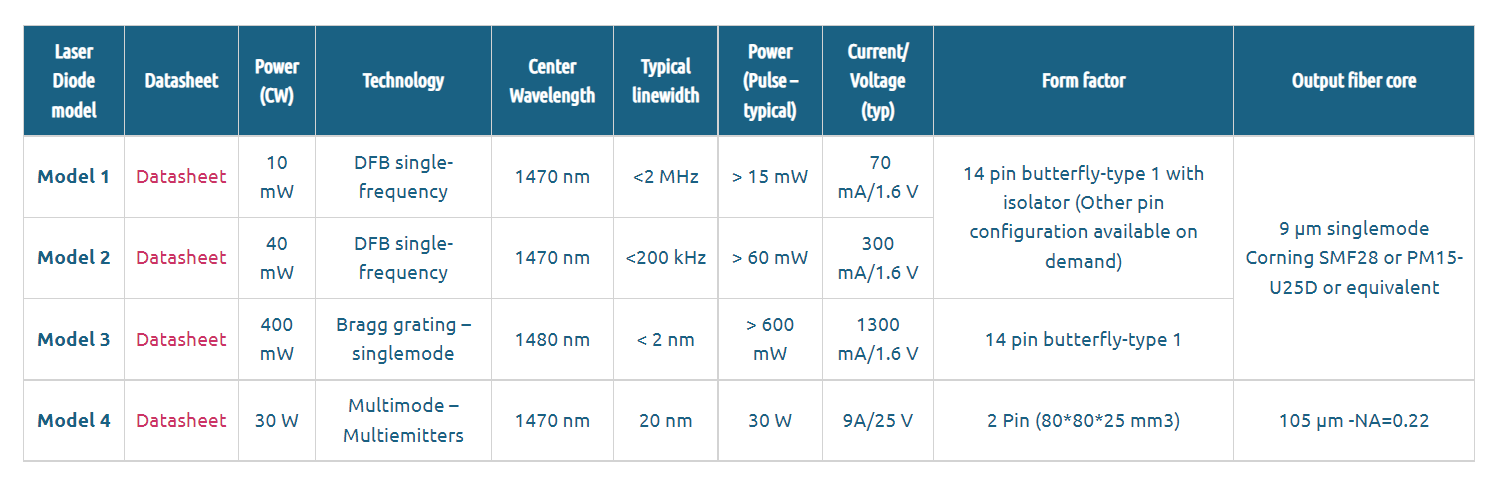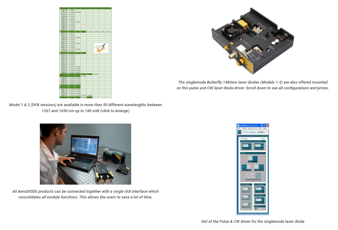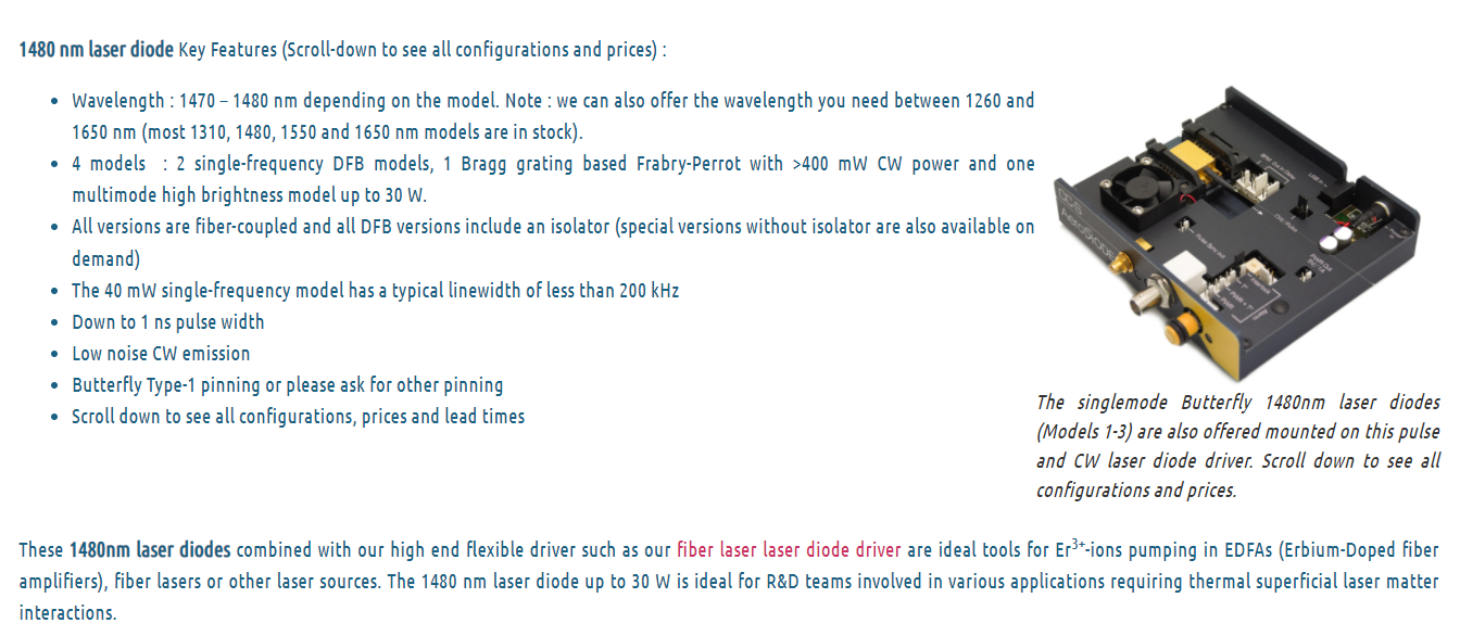 The singlemode 1480 nm laser diodes are extremely stable and low noise in CW regime due to the DFB or Bragg-grating technologies. Most Turn-key diode + driver solutions are optimized from single-shot to CW performances with pulse width lengths down to 1 nanosecond. The 1480nm laser diode precision pulses are generated internally by an on-board pulse generator, or on demand from an external TTL signal.
