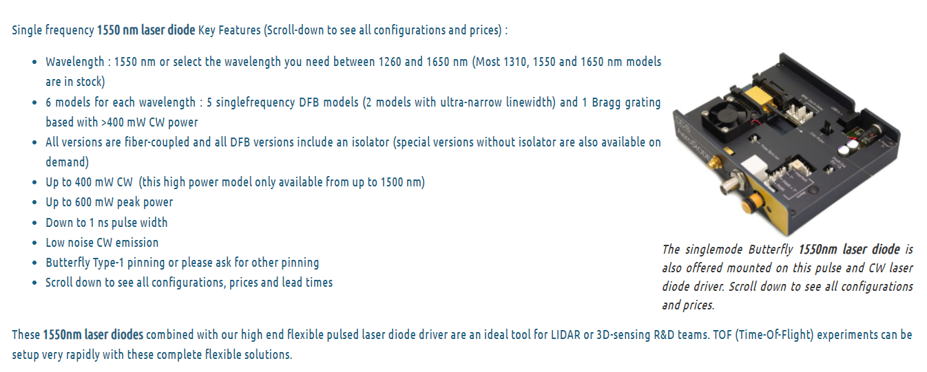 These fiber-coupled 1550 nm laser diodes are offered as stock items or associated with a CW or Pulsed Laser Diode Driver. 5 DFB models are single-frequency versions up to 120 mW. They are compatible with our high speed nanosecond pulsed drivers and this makes it an optimal solution for sensing applications like LIDAR Time-of-Flight, FMCW or 3D-sensing.
