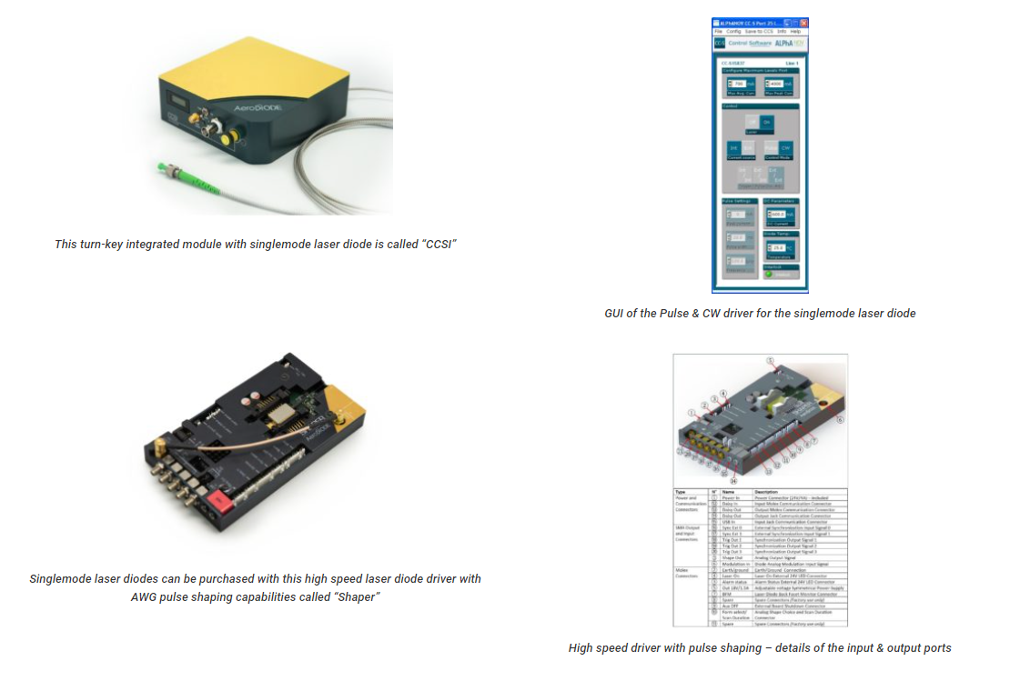 These singlemode 1550 nm laser diodes can reach high power in nanosecond pulse regime up to 500 mW. Most Turn-key diode + driver solutions are optimized from single-shot to CW performances with pulse width lengths down to 1 nanosecond. The 1550nm laser diode precision pulses are generated internally by an on-board pulse generator, or on demand from an external TTL signal. It becomes easy to generate complex burst shapes.