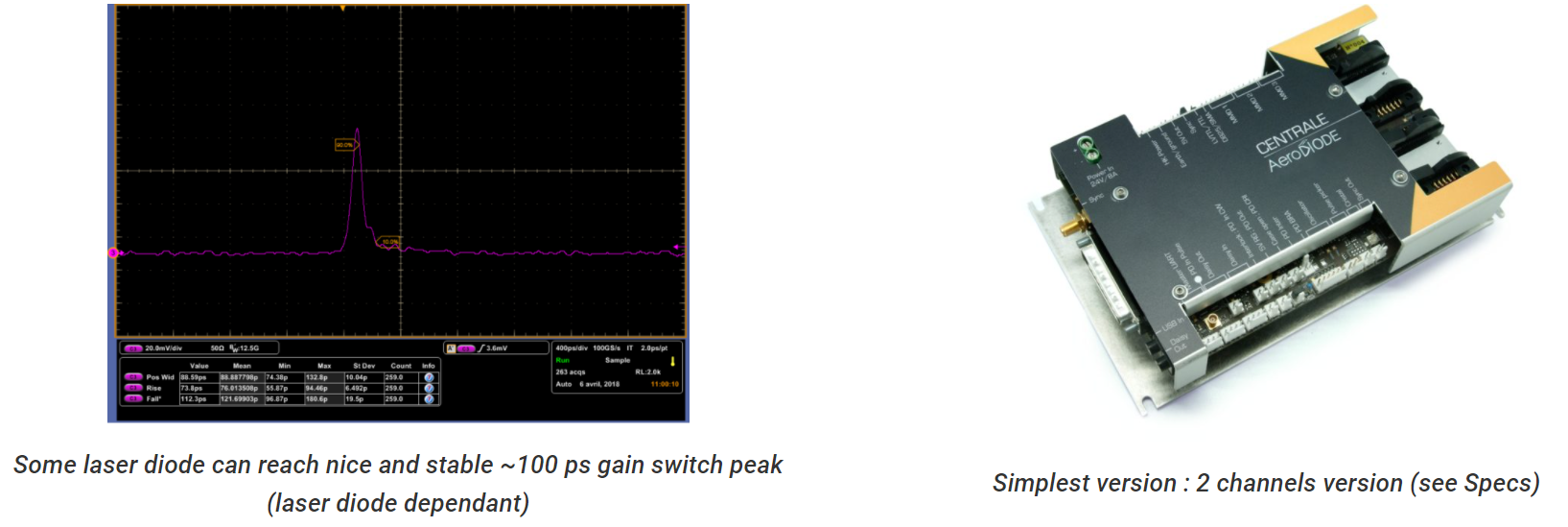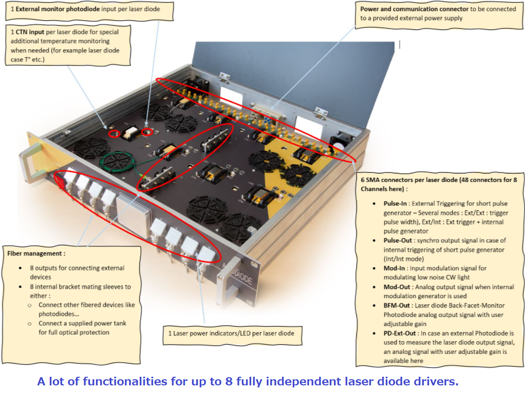 This laser diode driver & temperature controller allows fully independent control of up to 8 laser diodes from CW down to very short pulses. It includes several functions such as one pulse generator and one very low noise current and modulation driver per laser diode.