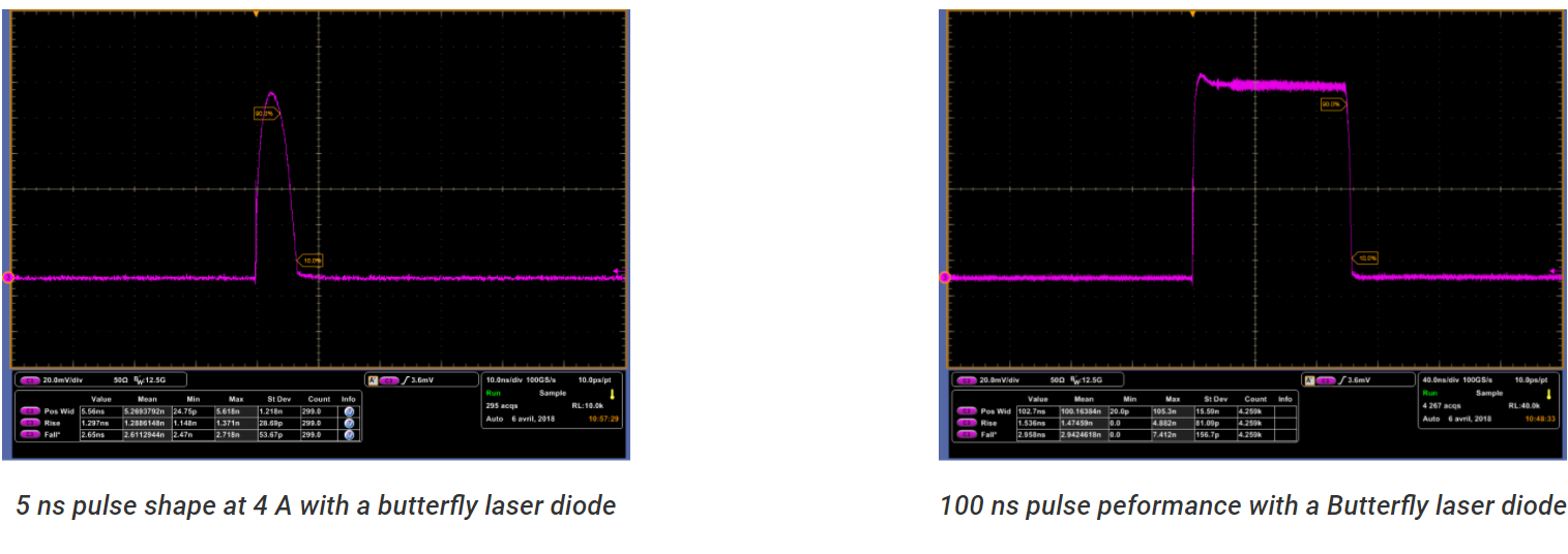・Fully independent control of CW/Pulse duration, Peak/CW powers, pulse rep rate, compliance voltage, pulse overshoot, chip temperatures