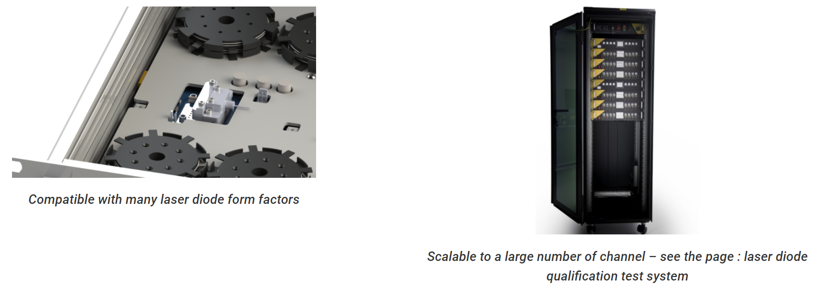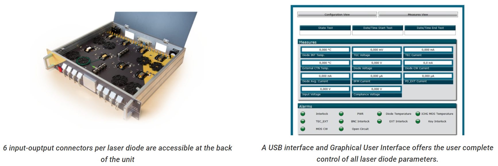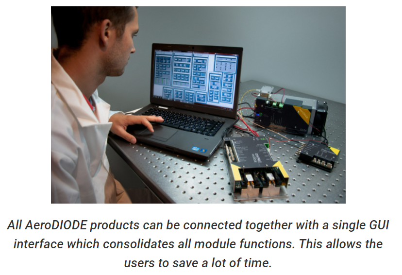 This Laser Diode Driver is a precision module able to drive simultaneously and independently several laser diodes in any operating regime. The current level ranges up to 4 A in pulse regime and 2.5 A in CW with a current resolution down to 0.05 mA. Whereas it is often used for fiber coupled laser diodes, it is also compatible with any type of laser diode form factor. It is controlled by an easy-to-use graphical interface and contains more than 6 connectors per laser diode for various external analog input/outputs signals.