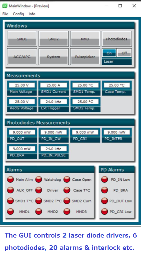 This fiber laser diode driver allows you to develop a complete fiber laser prototype in only a few weeks. There is one “pulsed & CW” channel for seed laser diode and one “CW” channel for pump laser diode. It is compatible with any type of fiber laser architectures : Mode-locked, Q-Switch, MOPA with any type of seeder like EOM modulated diodes, Gain Switched diodes, Microchip etc.