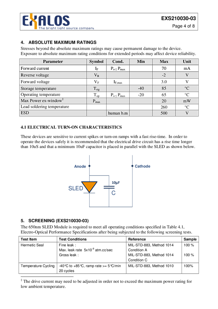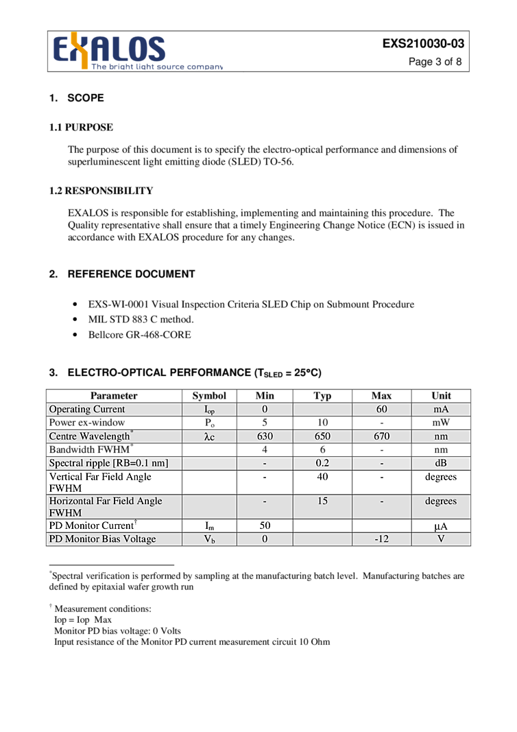650nm Exalos SLD offers the following key specifications and features in the attached data sheet. Operating current is rated at 60 mA maximum. The power ex-window is is 10mW. The center wavelength of this Laser is 650nm. and the bandwidth FWHM is 6nm.