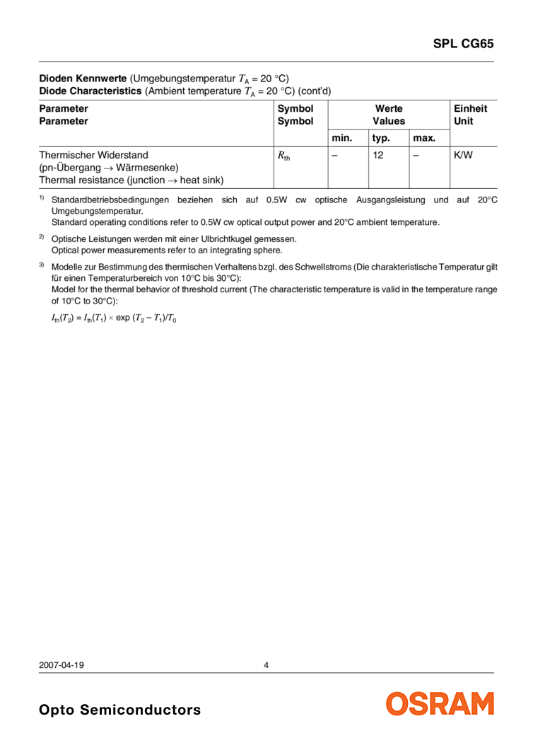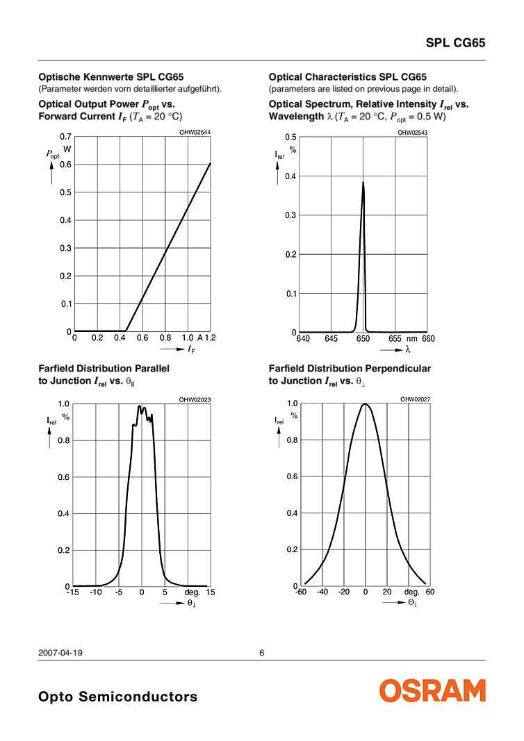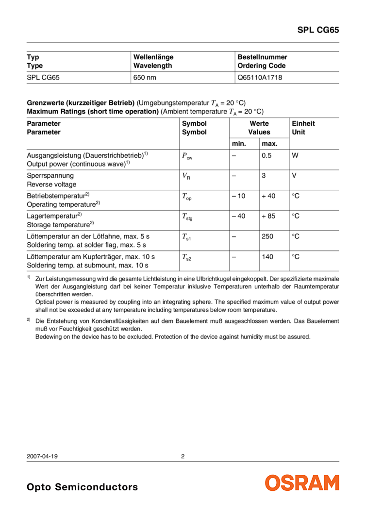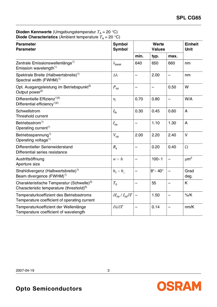 650nm The data sheet attached for the Osram 650nm laser details a 500mW optical output power device which has an operating current of 1.30 Amps and operating voltage of 2.20 Volts. This 650nm device features include beign an efficient radiation source for cw operation with a lateral laser aperture of 100 μm. The small C-type copper submount for OEM designs is described. Key applications include medical applications (cancer treatment, ophthalmology, dermatology) as well as pumping of solid state lasers (LiSAF, LiCAF) and alignment as well as laser shows.