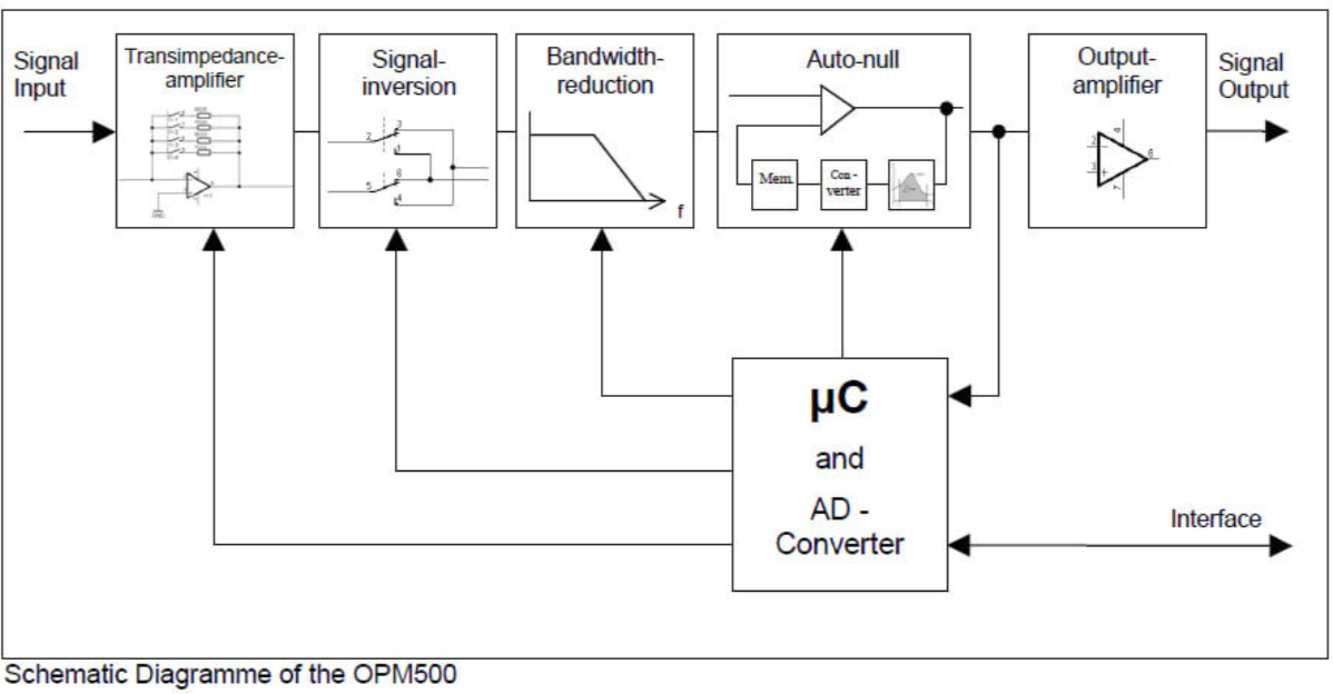 The current from the photodiode is converted to a voltage through a precise transimpedance amplifier. This amplifier is very linear over the full measurement range of the device. The OPM500 has 6 gain ranges. The switch is a semiconductor device, free from degradation. A unique feature of the OPM500 is the auto-null function. Further functions include signal inversion and bandwidth reduction. The analogue output signal is available at the BNC connector on the front panel an on the appropriate line on the interface port on the back panel.