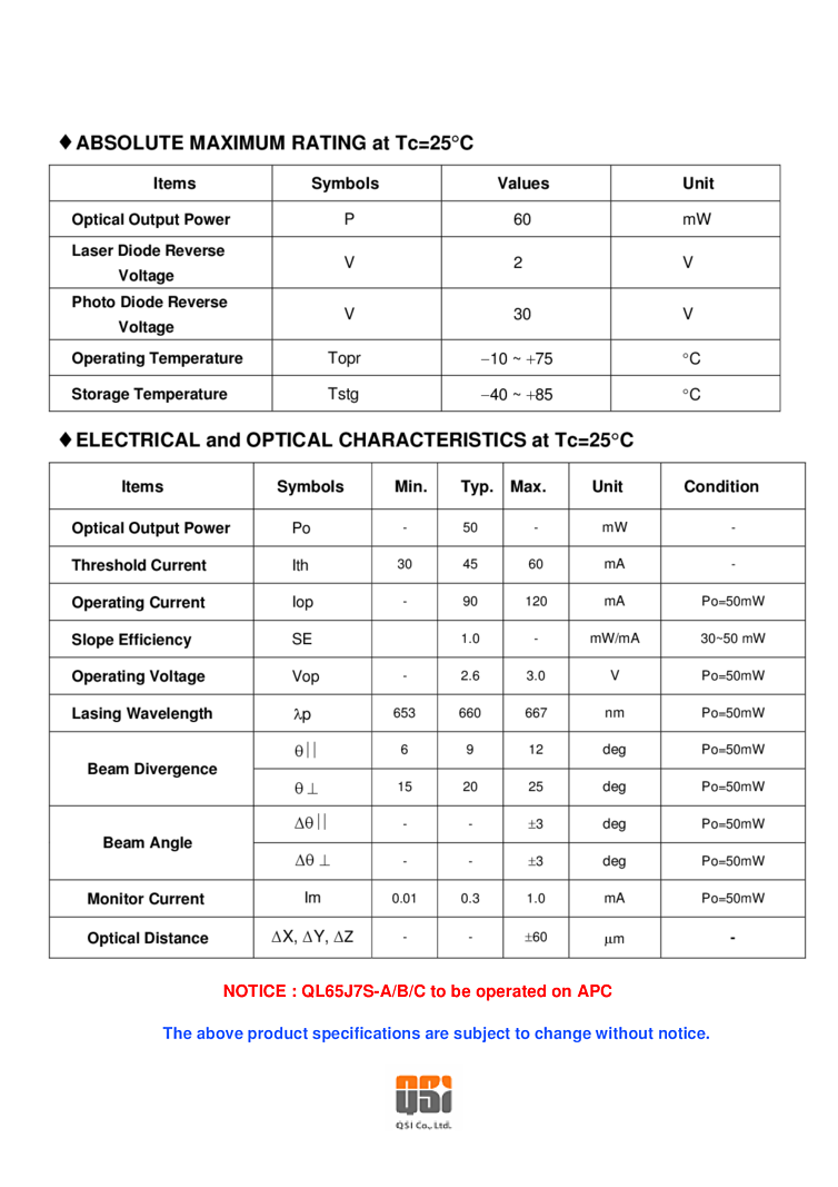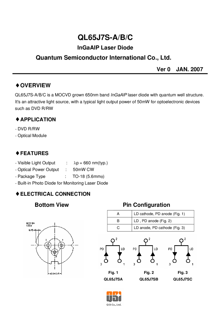 660nm QL65J7S-A/B/C InGaAlP Laser Diode. Manufactured by QSI Laser, Quantum Semiconductor International Co., Ltd. The QL65J7S-A/B/C is an MOCVD grown 650nm band InGaAlP laser diode with quantum well structure.
