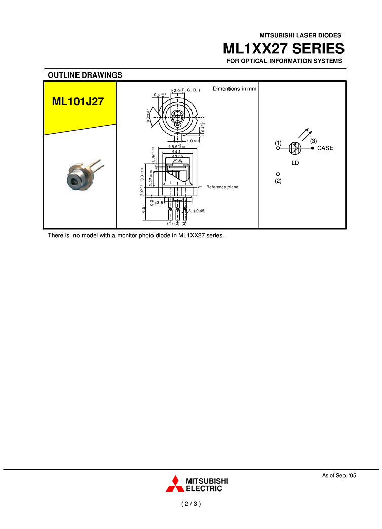 660nm ML1XX27 SERIES MITSUBISHI LASER DIODES FOR OPTICAL INFORMATION SYSTEMS:
