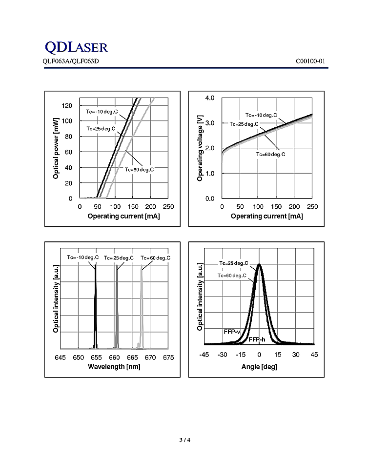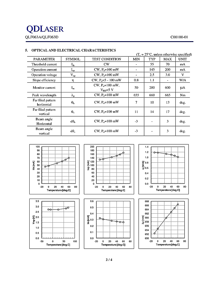 660nm The QLF063A/QLF063D are 660 nm quantum well laser devices designed for high output power application. The laser diode is mounted into a TO-56 header including a monitor PD and hermetic sealed with a flat glass cap.
