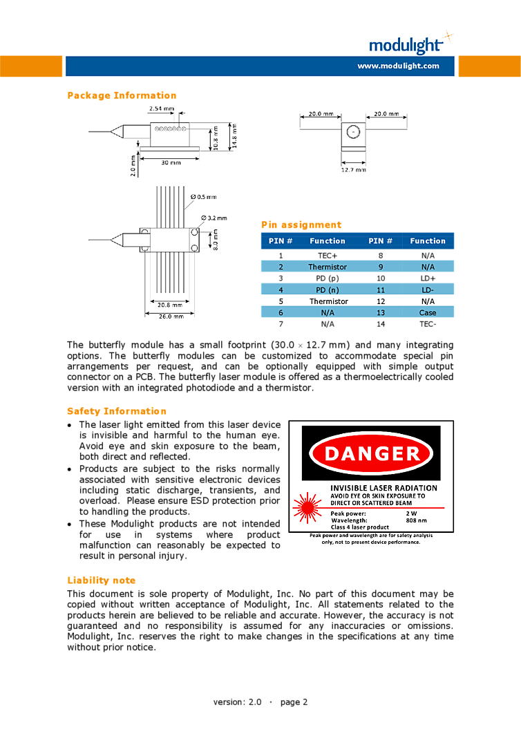 808nm The 14-pin butterfly package laser diode series offers compact means of utilizing the performance of Modulight single emitter chips. The package withholds an internal TEC and photodiode. Standard configuration includes a 100 µm core fiber and an SMA-905 connector. Other connector and fiber types are available on request. Applications include illumination, optical pumping, and therapeutic procedures in the medical market. Additional applications include measurement and analysis, diagnostics and aesthetic treatments.