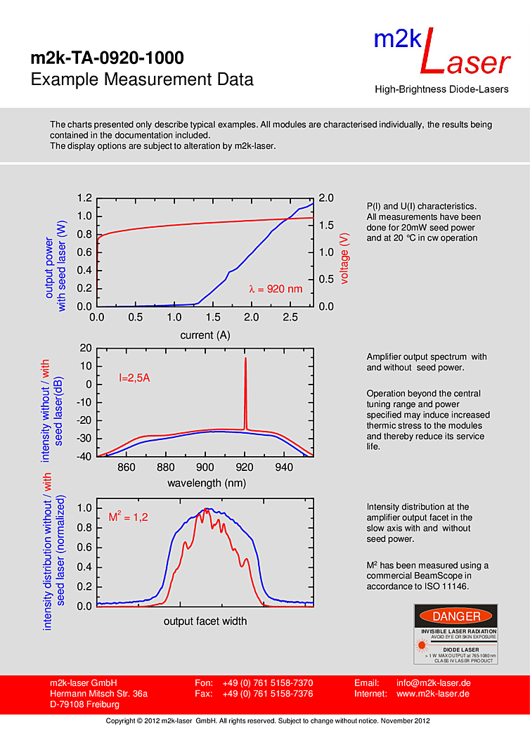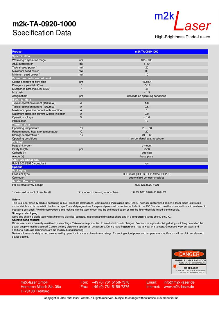 895nm-935nm from m2k lasers. Advantages include tuning range between 895nm and 935nm, suitable for MOPA setups up to 1000mW, nearly diffraction limited with M2 (1/e²) < 1.5, side mode suppression of more than 40 dB, and highly anti-reflection facet coatings < 0.01%. Different packages are available.